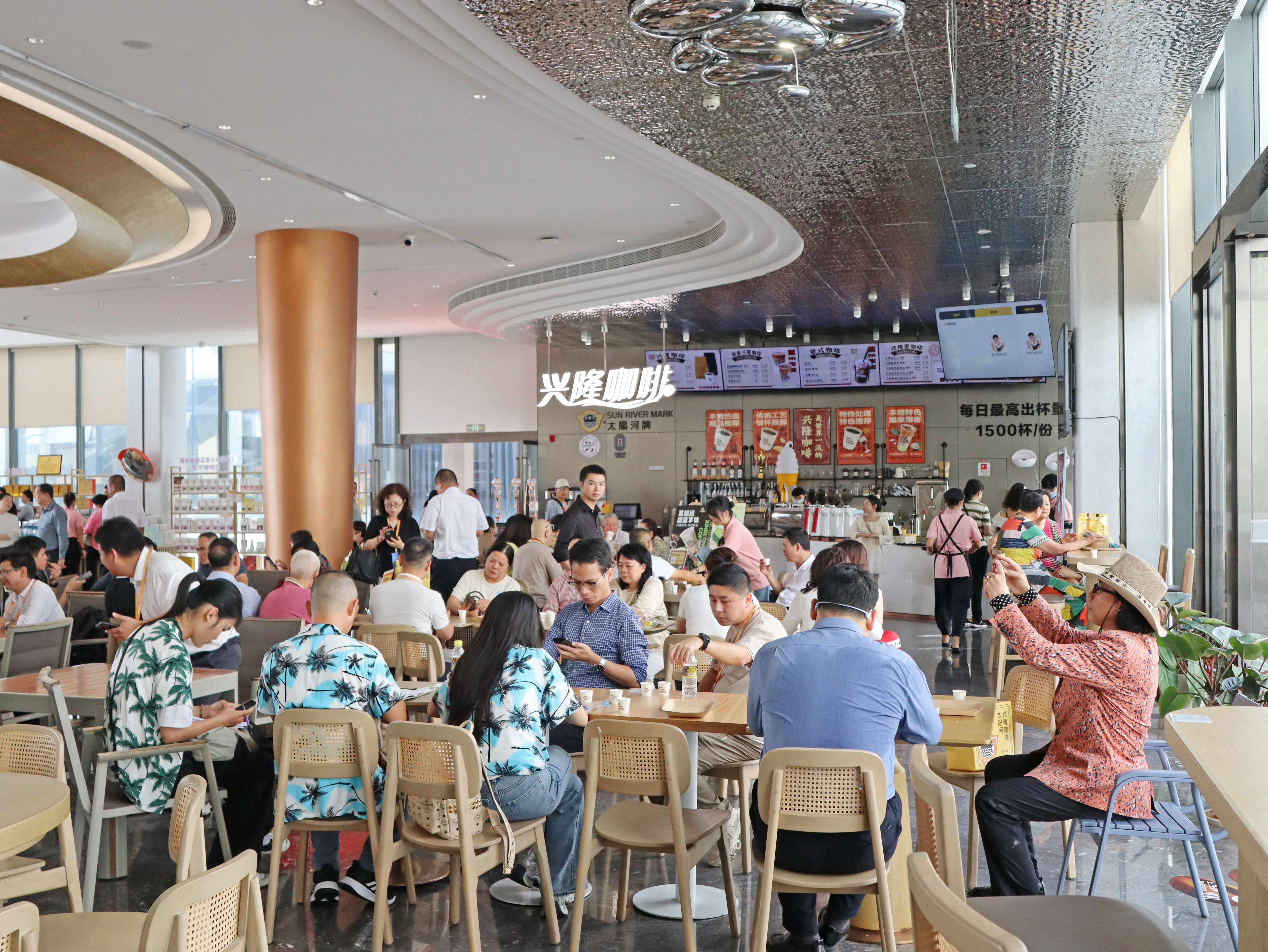 ▲代表团一行在正大・兴隆咖啡文化园品鉴兴隆炭烧咖啡。